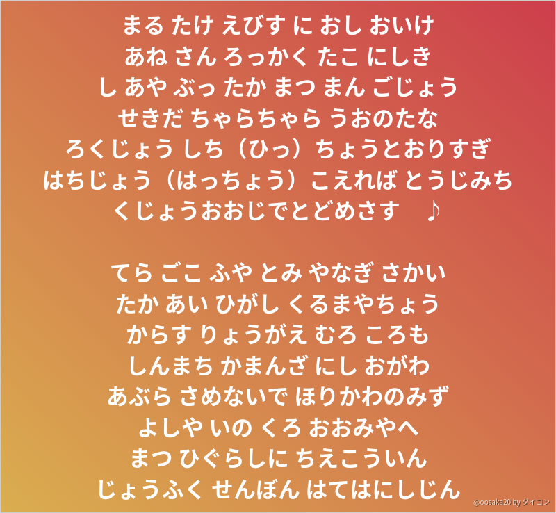 M A I בטוויטר まるたけえびすにおしおいけ あねさんろっかくたこにしき し あやぶったかまつまんごじょう せったちゃらちゃらうおのたな ろくじょうひっきょうとおりすぎ はっちょうこえればとおじみち くじょうおおじてとどめさす Http T Co Lv6sjavtvd