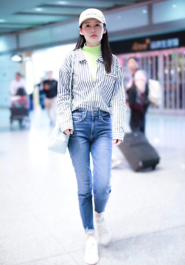 李沁私服 绿色打底衫 条纹衬衫 清新减龄还时尚 你学会了吗